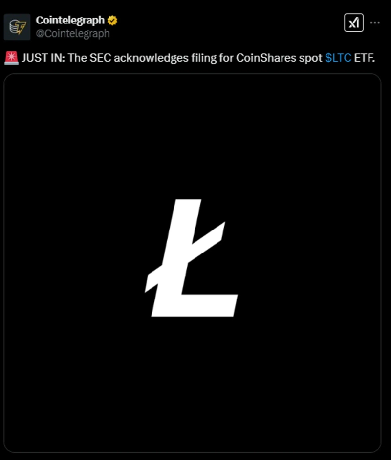According to the CoinTelegraph's X (formerly Twitter) account on the 19th (local time), the U.S. Securities and Exchange Commission (SEC) has officially confirmed the receipt of CoinShares' application for a Litecoin (LTC) spot Exchange-Traded Fund (ETF).