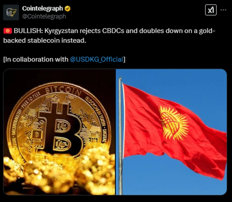 According to the cryptocurrency media CoinTelegraph's X (formerly Twitter) account on the 19th (local time), it has been reported that the Kyrgyzstan government announced its decision to focus on gold-based stablecoins instead of Central Bank Digital Currency (CBDC).
