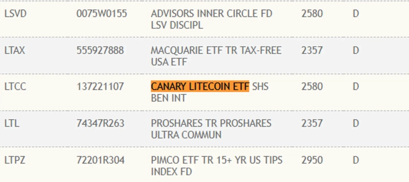 Canary Fund's Litecoin (LTC) ETF has been registered with the US Depository Trust & Clearing Corporation (DTCC).