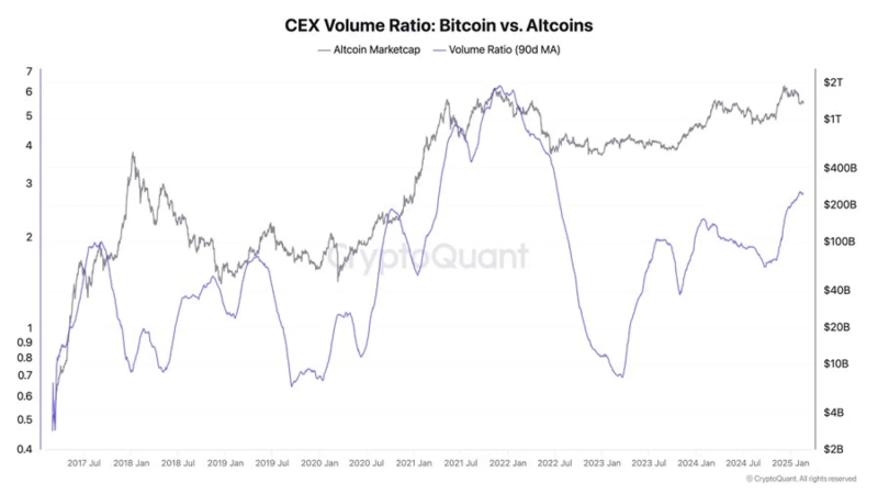 On the 21st (local time), Ki Young Ju, CEO of CryptoQuant, stated "Alt season has begun. Stablecoin holders are showing preference for altcoins. Altcoin trading volume is 2.7 times that of Bitcoin."