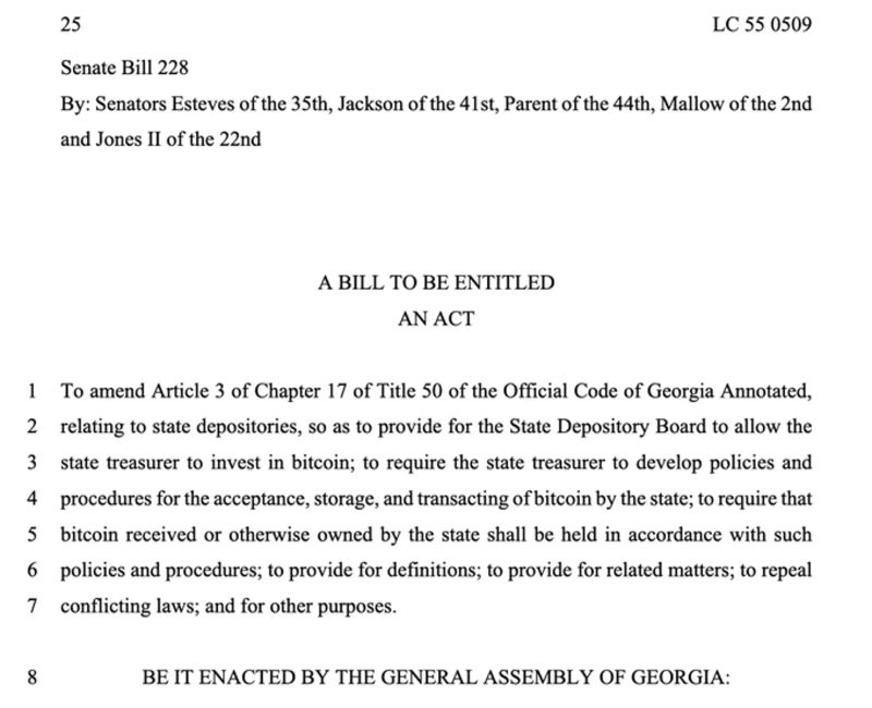 According to CoinTelegraph on the 24th, Georgia submitted its second Bitcoin reserve bill 'SB 228'. The bill primarily aims to remove the limit on Bitcoin investments.