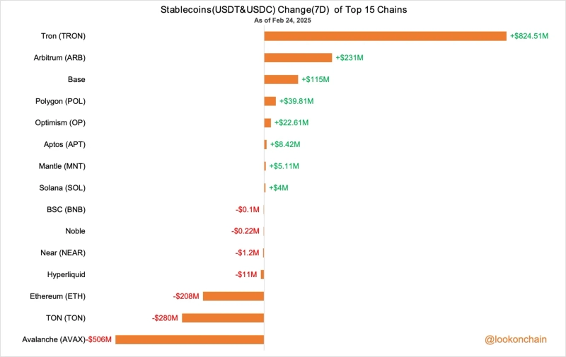 Over the past 7 days, Tether (USDT) and USDC inflows to the TRON (TRX) network reached approximately $800 million.