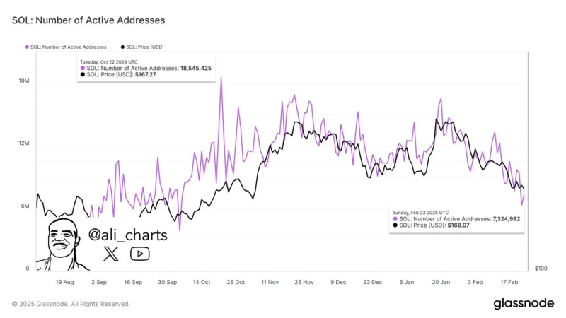 According to Glassnode data, Solana's active addresses have significantly decreased from 18.5 million in October last year to 7.3 million.