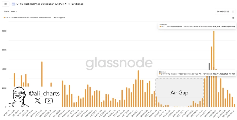 On the 25th (local time), cryptocurrency analyst Ali Martinez stated through his X (Twitter) that "for Bitcoin, there are no meaningful support levels between $93,198 and $70,440."