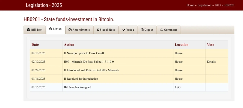 - Announced that Wyoming's Bitcoin investment bill (HB0201) has been rejected.