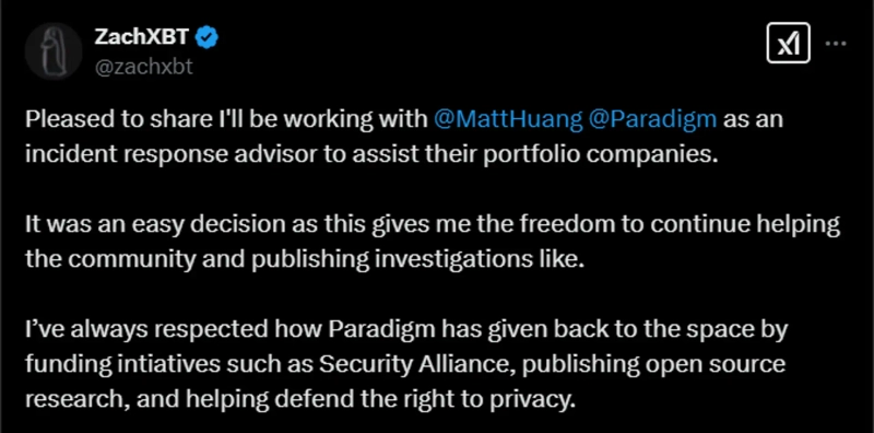 - ZachXBT revealed that he will collaborate with Paradigm as an incident response advisor.