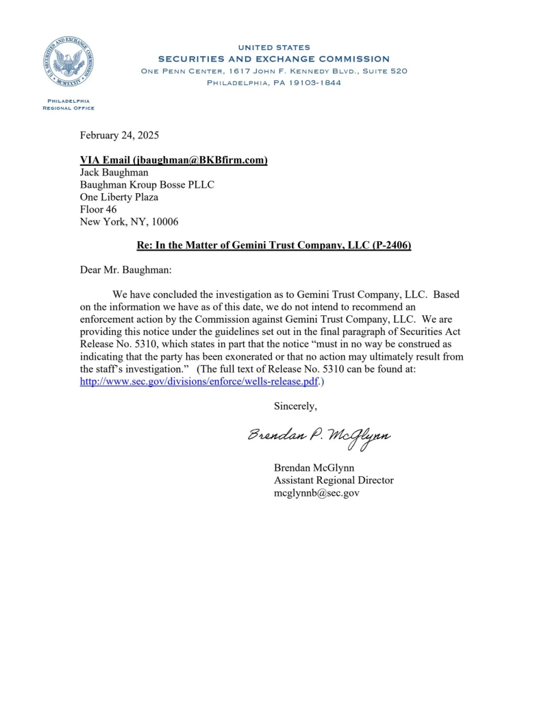 The U.S. Securities and Exchange Commission (SEC) has concluded its investigation into cryptocurrency exchange Gemini and decided not to take any disciplinary actions.