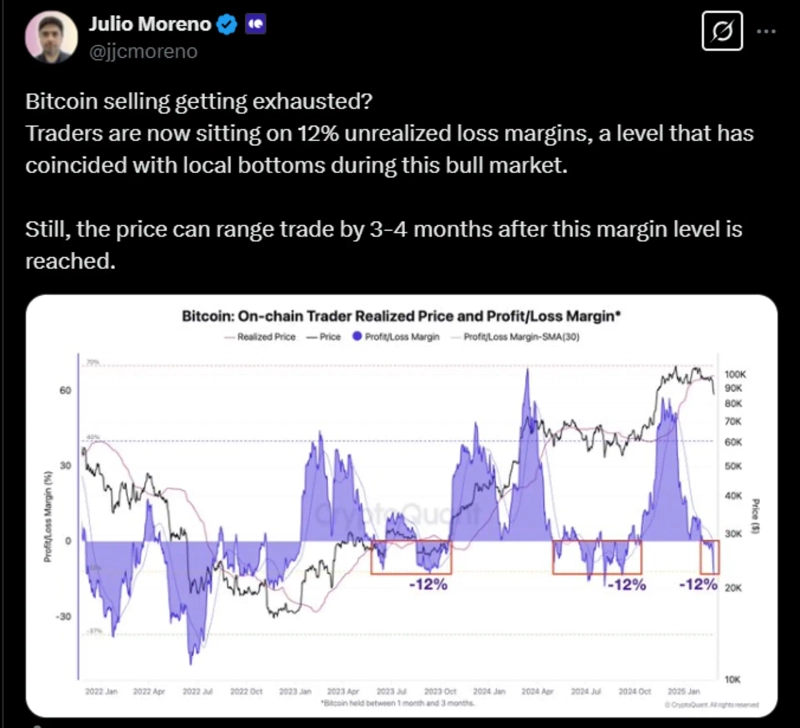 - Julio Moreno, Senior Analyst at CryptoQuant, revealed that Bitcoin selling pressure is being exhausted, and traders are experiencing an average of 12% unrealized losses.