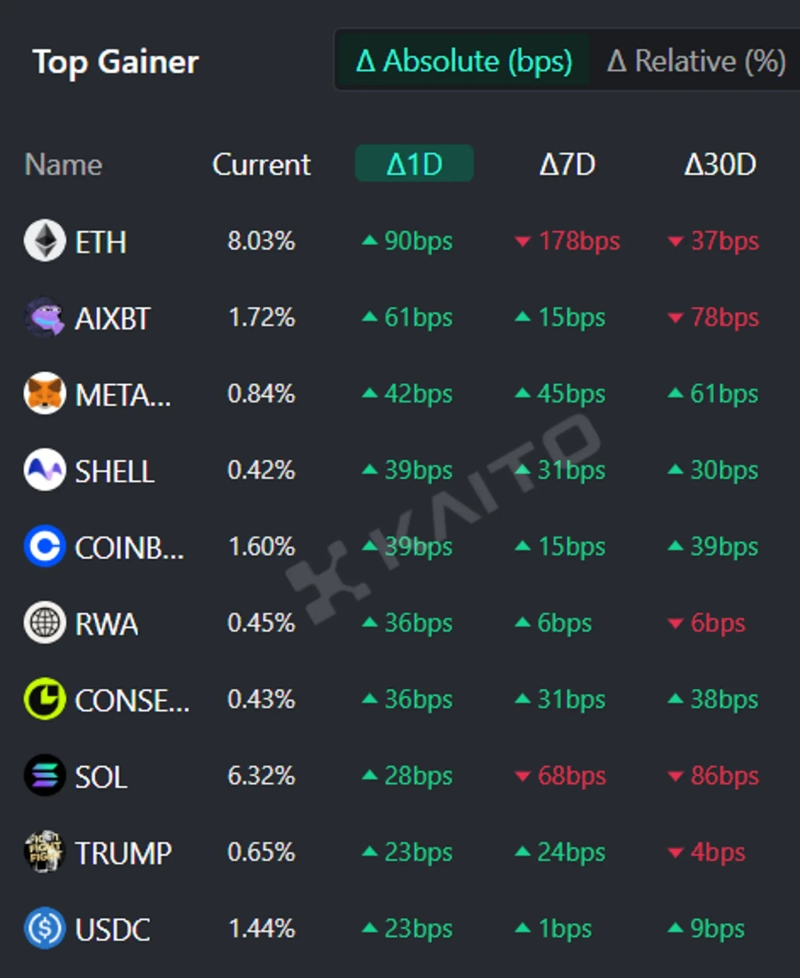 According to the Token Mindshare Top Gainers from Kaito, an AI-based Web3 search platform (Token Mindshare is a metric that quantifies the influence of specific tokens in the virtual asset market), the top 5 virtual asset-related keywords that people are showing the most interest in as of the 28th are Ethereum (ETH), AIXBT, MetaMask, MyShell (SHELL), and Coinbase.