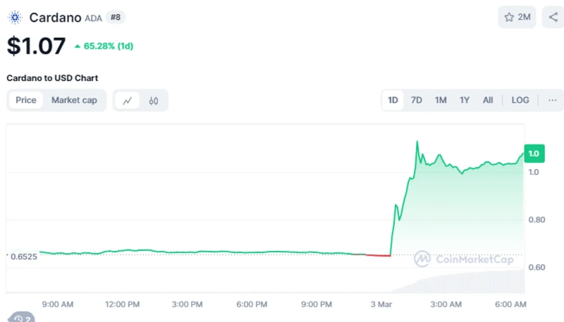 Ada (ADA) has surged during trading hours. Analysis suggests that investor sentiment has significantly strengthened after President Donald Trump mentioned Ada in his post about cryptocurrency reserves.