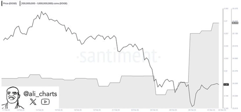 On the 2nd (local time), cryptocurrency analyst Ali Martinez revealed via X that "whales have purchased more than 140 million DOGE in the past 24 hours."