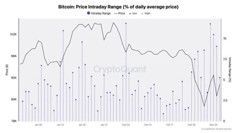 On the 6th (local time), Julio Moreno, Head of Research at CryptoQuant, stated via X that "Bitcoin's daily average price fluctuation exceeded 12% this week. This indicates increased market uncertainty."
