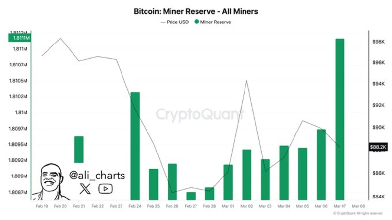 On the 8th, virtual asset (cryptocurrency) analyst Ali Martinez revealed through X (formerly Twitter) that "miners have not sold a single Bitcoin since the 28th of last month."