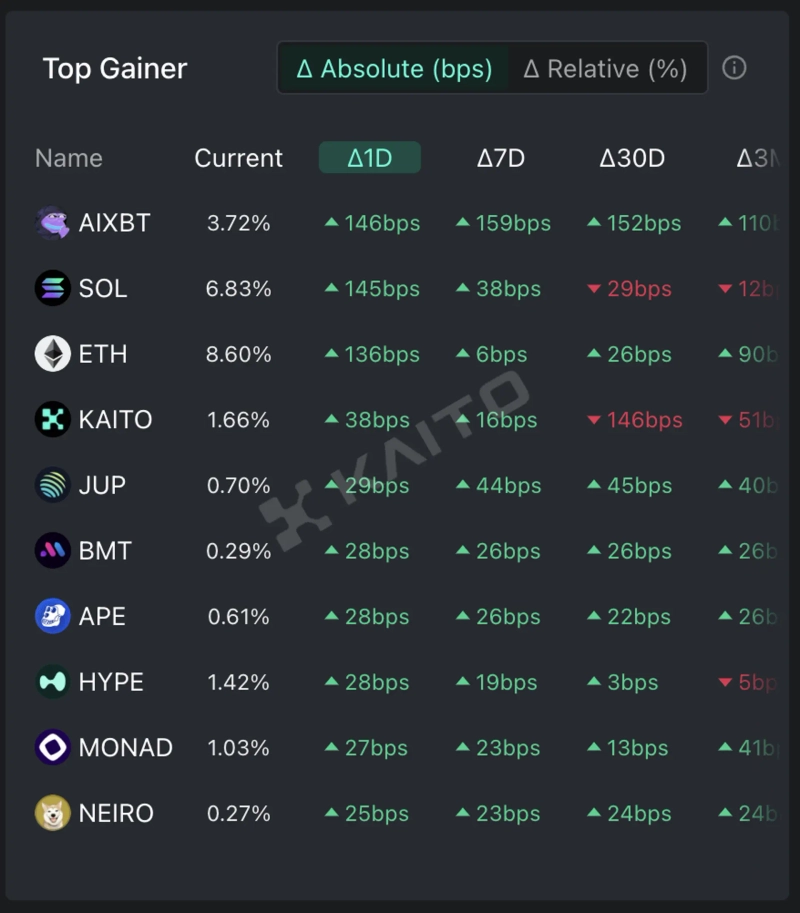 According to Token Mindshare's top gainers from Kaito, an AI-based Web3 search platform (Token Mindshare is a metric that quantifies the influence of specific tokens in the virtual asset market), the top 5 virtual asset-related keywords that people are showing the most interest in as of the 9th are AIXBT, Solana (SOL), Ethereum (ETH), Kaito (KAITO), and Jupiter (JUP).