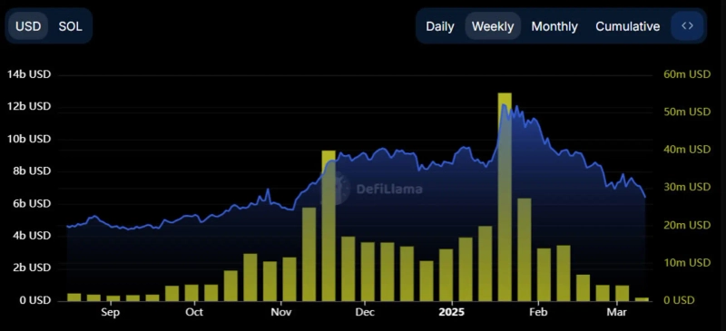 Solana (SOL)'s weekly fee revenue has reached its lowest level since September last year.