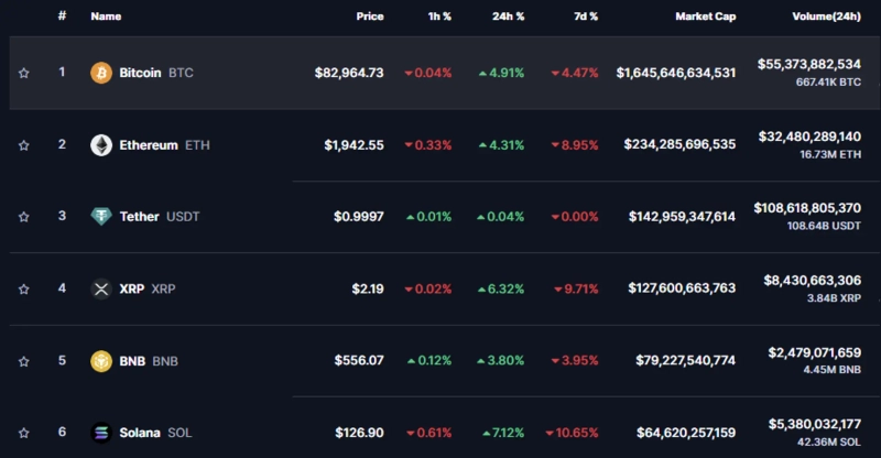 As of 6:30 AM on the 12th (Korean time), Bitcoin (BTC) is trading at $82,964, up 4.91% from the previous day. At the same time, most major altcoins also rose, including Ethereum (+4.31%), XRP (6.32%), BNB (+3.80%), and Solana (+7.12).