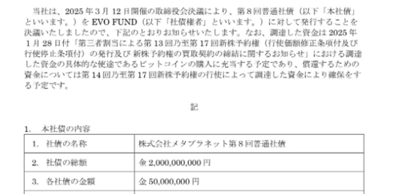 On the 12th (local time), Metaplanet announced via X (Twitter) that "we have issued 2 billion yen in zero-interest ordinary corporate bonds for additional Bitcoin purchases."