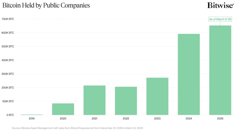 On the 12th (local time), Bitwise analyst Ryan Rasmussen announced via X that "Bitcoin purchases by listed companies last year were twice as much as the total purchases of all previous years combined" and that "currently, more than 70 companies hold $52 billion worth of Bitcoin." He added, "This represents about 3% of the total Bitcoin supply" and "eventually, governments will also start buying Bitcoin."