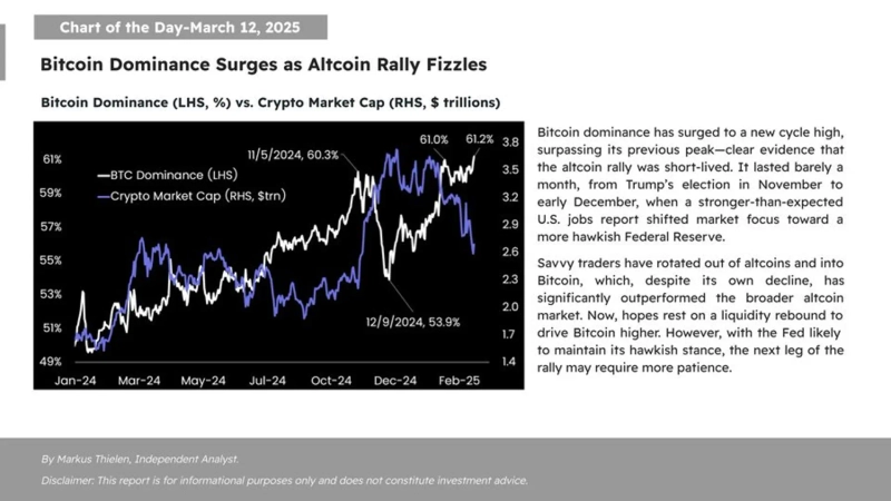 Recent analysis suggests that as Bitcoin (BTC)'s market share in the cryptocurrency market has soared to 61.2%, the short-term rally of altcoins has effectively ended.