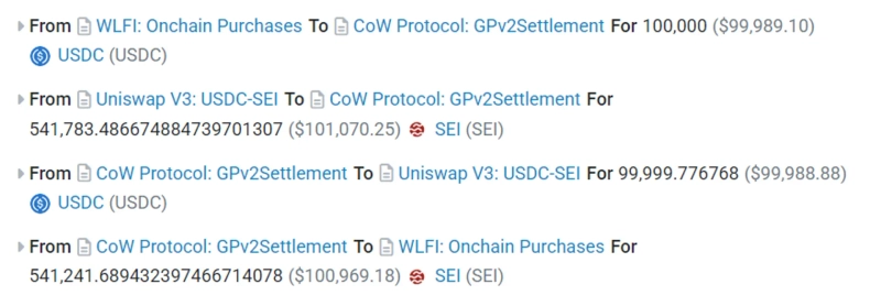 According to Wu Blockchain on the 14th (local time), a suspected World Liberty Financial address used $100,000 to purchase 541,242 SEI through Cow Protocol this morning.