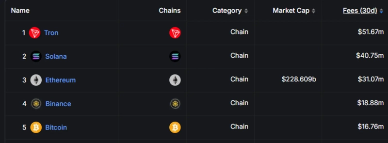 On the 18th (local time), Satoshi Club announced via X that "TRON earned $51 million in fee revenue over the past 30 days," calling it "the blockchain with the highest revenue." Solana (SOL) and Ethereum (ETH) recorded $40.75 million and $31.07 million respectively.