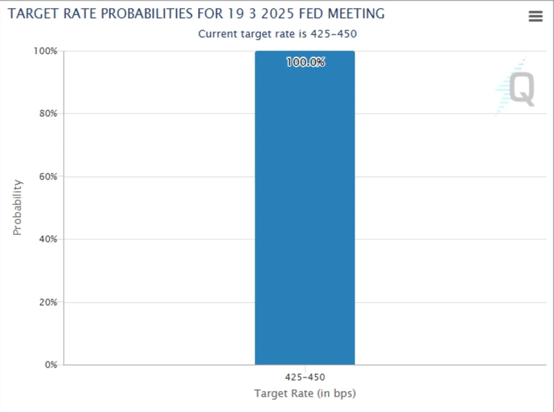 As of 7:53 AM on the 19th (Korean time), according to CME FedWatch, the probability of a rate freeze at the March FOMC is currently 100%. The Fed is scheduled to announce its decision on the benchmark interest rate at 3 AM on the 20th after a two-day FOMC meeting.