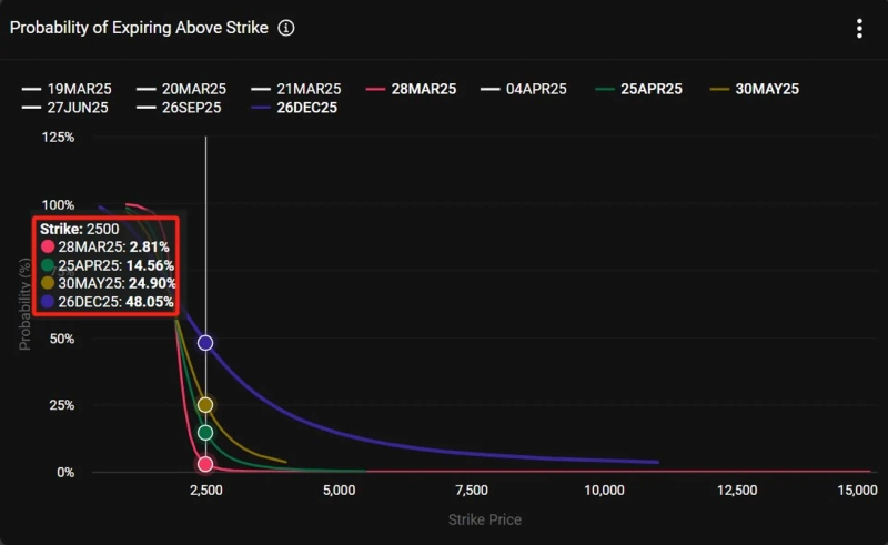 The options market indicates that Ethereum (ETH) has a 48% probability of surpassing $2,500 by the end of the year.