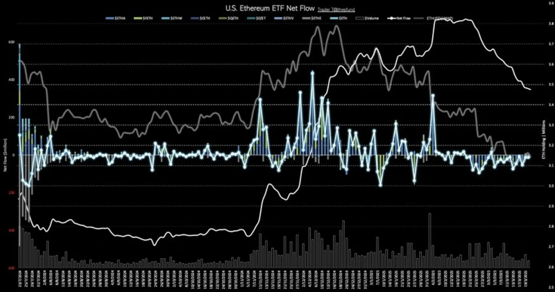 According to Trader T on the 21st (local time), $12.4 million (approximately 18.2 billion KRW) was withdrawn from the US Ethereum Spot ETF the previous day, with only one day of inflow recorded in the past 21 days, bringing the total outflow to $752 million.