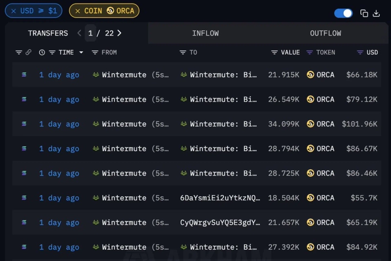 Cryptocurrency market maker Wintermute has reportedly transferred all tokens of ORCA received from Orca to a centralized exchange (CEX). As a result, the price of ORCA plummeted nearly 30% in a single day.