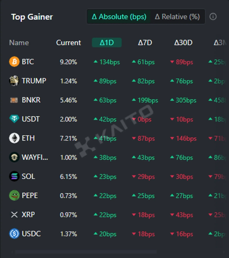 According to the Token Mindshare (a metric quantifying the influence of specific tokens in the virtual asset market) top gainers of the AI-based Web3 search platform Kaito, the top 5 keywords related to virtual assets that people are most interested in as of the 24th are Bitcoin (BTC), OfficialTrump (TRUMP), Banker (BNKR), Tether (USDT), and Ethereum (ETH).