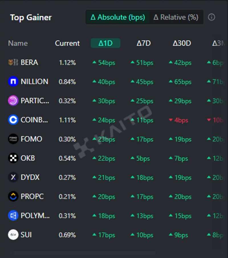 According to the top gainers on the Token Mindshare of the AI-based Web3 search platform Kaito, the top five keywords related to cryptocurrencies that people are most interested in as of the 25th are Berachain (BERA), Nillion (NILLION), Particle Network (PARTI), Coinbase (COINBASE), and FOMO.