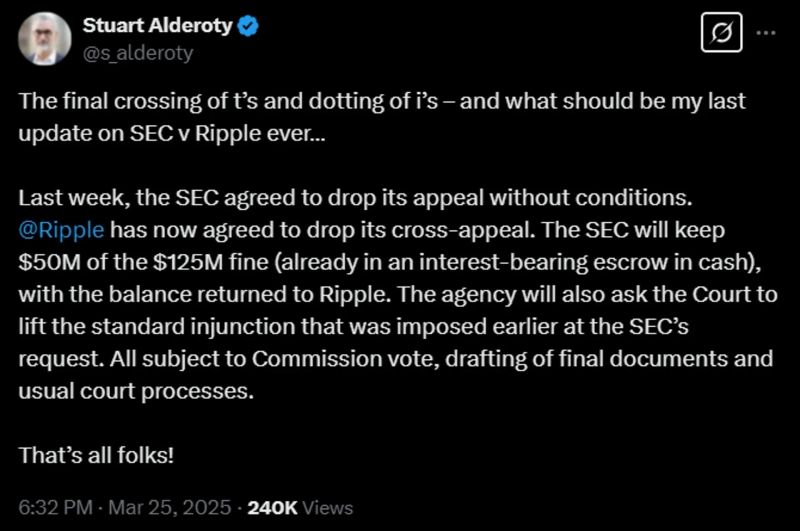 The U.S. Securities and Exchange Commission (SEC) has withdrawn its appeal against Ripple (XRP), and Ripple has agreed to withdraw its cross-appeal against the SEC.