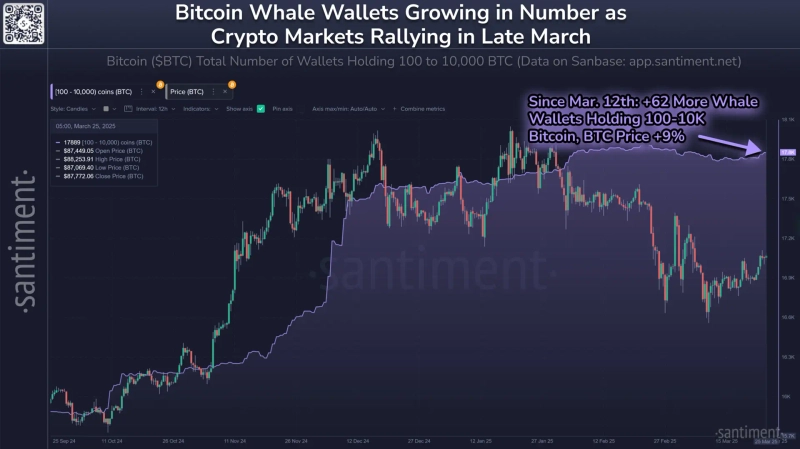 On the 25th (local time), Santiment stated on its official X (formerly Twitter) that "Bitcoin's price formed $77,500 two weeks ago, but recently soared to $88,350," explaining that "the number of whale wallets increased sharply right after the bottom, leading to the price rise."