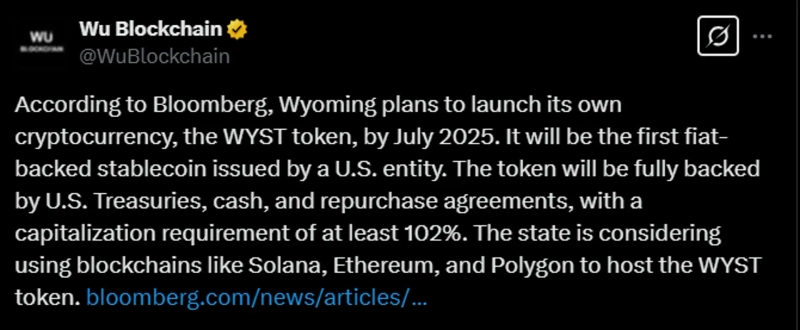 - Wyoming, USA, announced plans to launch its own stablecoin, WYST, by July.