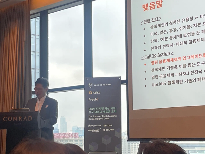 - Seokmoon Jeong, Director of Presto Research Center, stated that Korea must lift capital controls and issue a KRW stablecoin to achieve economic effectiveness.