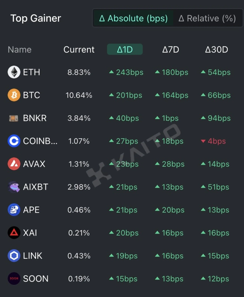 According to the top gainers of Token Mindshare (a metric quantifying the influence of specific tokens in the virtual asset market) by the AI-based Web3 search platform Kaito, the top 5 keywords related to virtual assets that people are most interested in as of the 29th are Ethereum (ETH), Bitcoin (BTC), Banker Coin (BNKR), Coinbase, and Avalanche (AVAX).