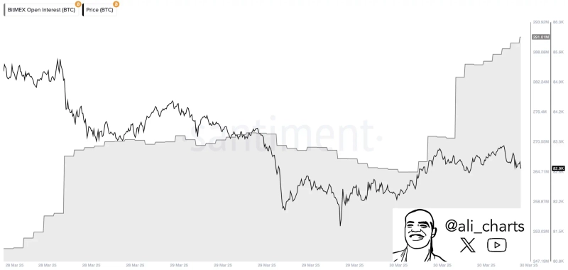 On the 31st (local time), cryptocurrency analyst Ali Martinez stated on X that "over the past 48 hours, Bitcoin open interest on BitMEX has surged from $250 million to $291 million."