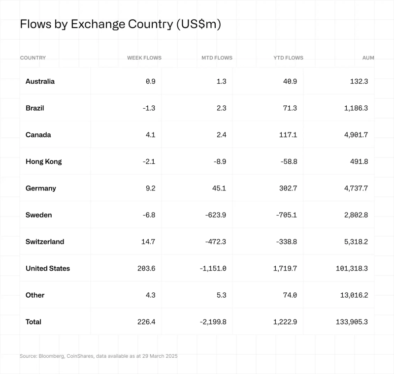 - By country, the United States had the largest net inflow of $204 million, with Switzerland and Germany also recording net inflows of $14.7 million and $9.2 million, respectively.
