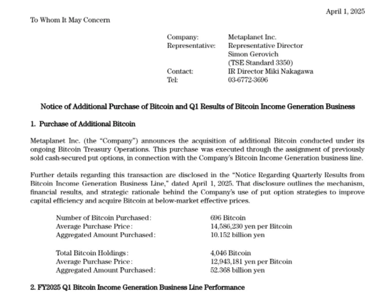 On the 1st (local time), Metaplanet announced on X that it had purchased an additional 696 BTC. With this purchase, Metaplanet's total Bitcoin holdings have reached 4046.