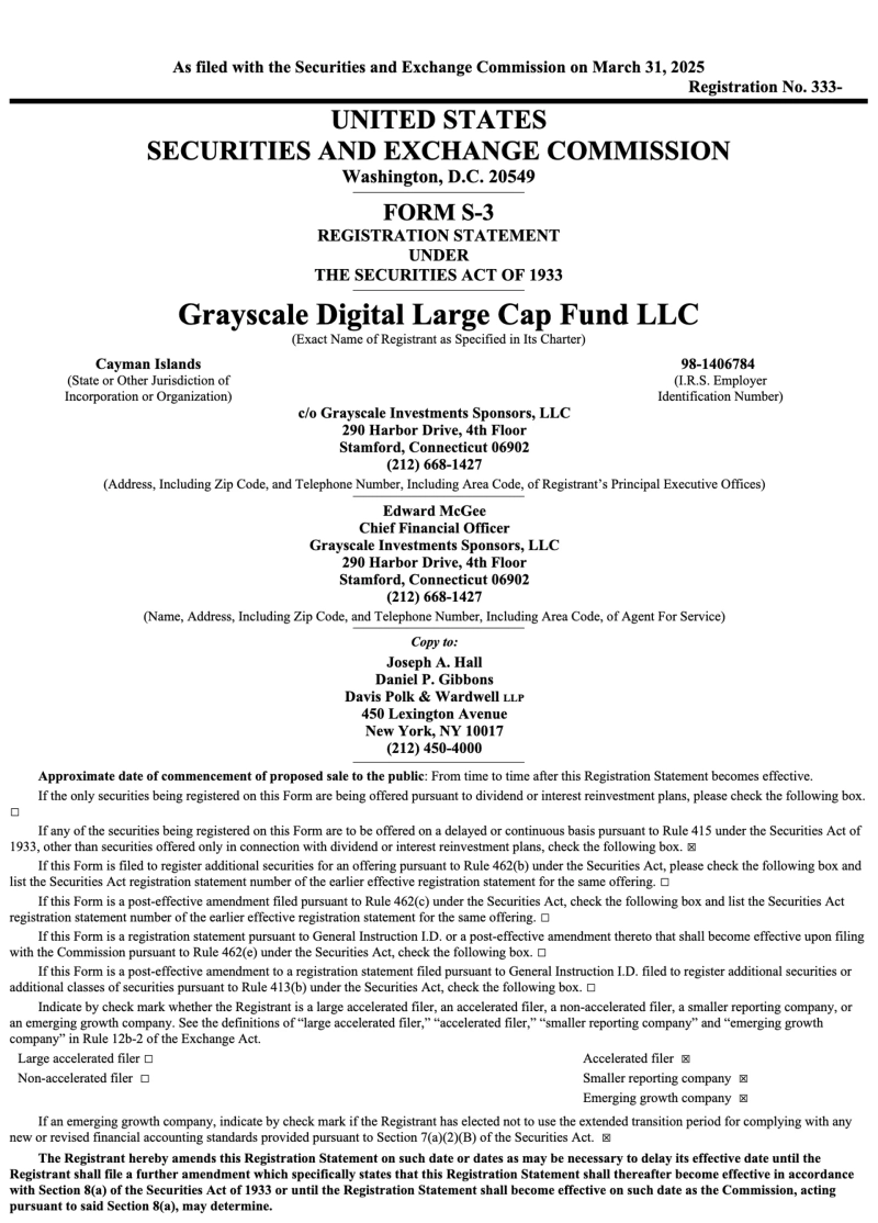 It has been revealed that Grayscale has submitted registration documents (S-3) for the conversion of its Digital Large Cap Fund into an Exchange-Traded Fund (ETF).
