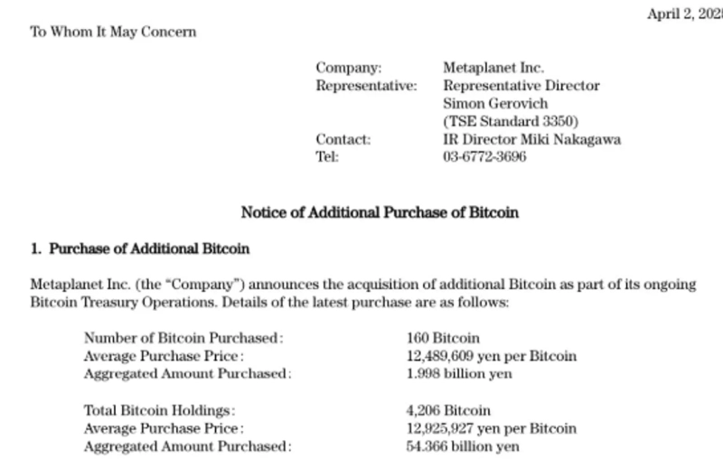 On the 2nd (local time), Metaplanet announced through its official X (Twitter) that it had purchased an additional 160 Bitcoins.