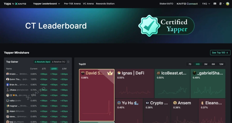 Yaps is different from simple activity scores. Users can participate in project evaluation, launchpad voting, and influence ranking (Yapper Leaderboard) competition within the Kaito ecosystem using Yaps. Top users on the Yapper Leaderboard also receive additional rewards such as airdrops or campaign invitations from the project side. In other words, Yaps functions as a 'proof of participation means' that creates economic value within the Kaito network.