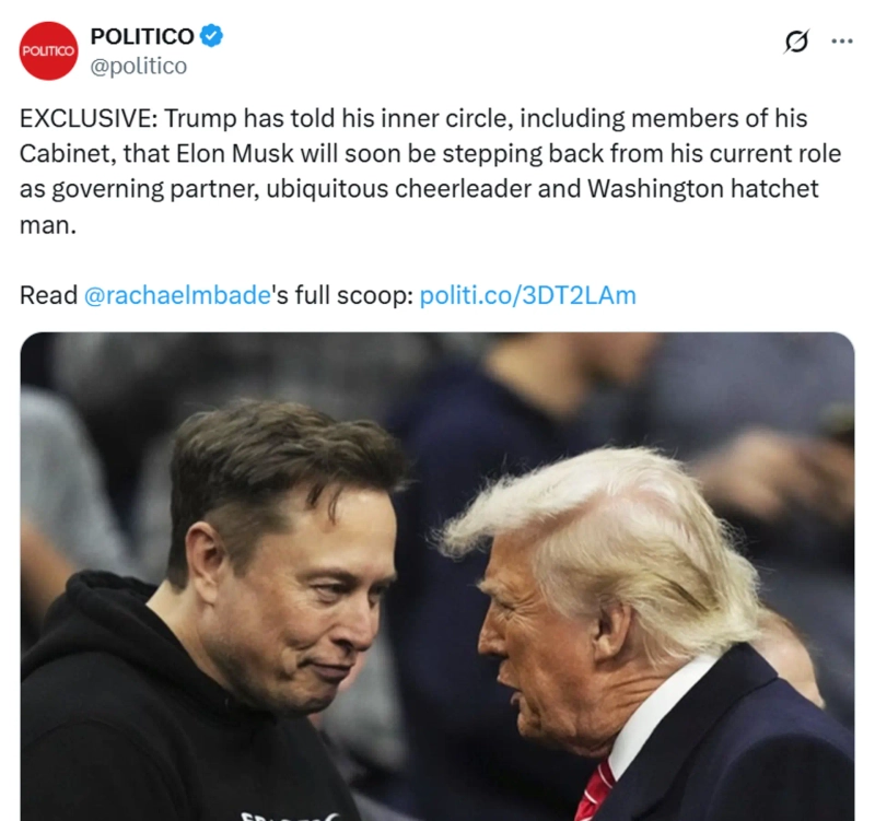 According to Politico on the 2nd (local time), U.S. President Donald Trump told his aides that "Elon Musk will step down from his current position within the next few weeks."