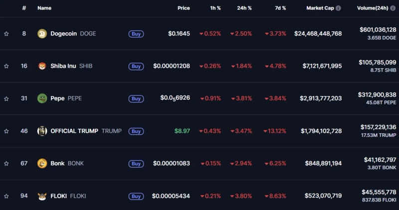 It's not just Dogecoin. At the same time, other top meme coins by market capitalization, such as Shiba Inu (-1.77%), Pepe (-3.64%), Official Trump (-3.44%), Bonk (-2.73%), Floki (-3.68%), and Fartcoin (-6.48%), have all declined compared to the previous day.