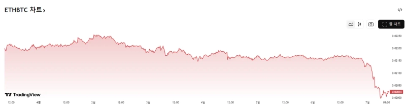 According to TradingView on the 7th, ETH/BTC is recorded at 0.02027. The indicator once hit 0.0197 during the day, marking an all-time low. It is explained that the value of Ethereum compared to Bitcoin continues to show a downward trend in the bear market.