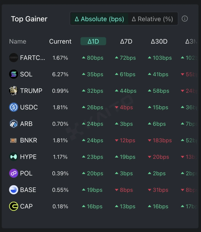 According to the Token Mindshare, a metric quantifying the influence of specific tokens in the virtual asset market, by the AI-based Web3 search platform Kaito, the top 5 keywords related to virtual assets that people are most interested in as of the 8th are Fartcoin (FARTCOIN), Solana (SOL), OfficialTrump (TRUMP), USDCoin (USDC), and Arbitrum (ARB).