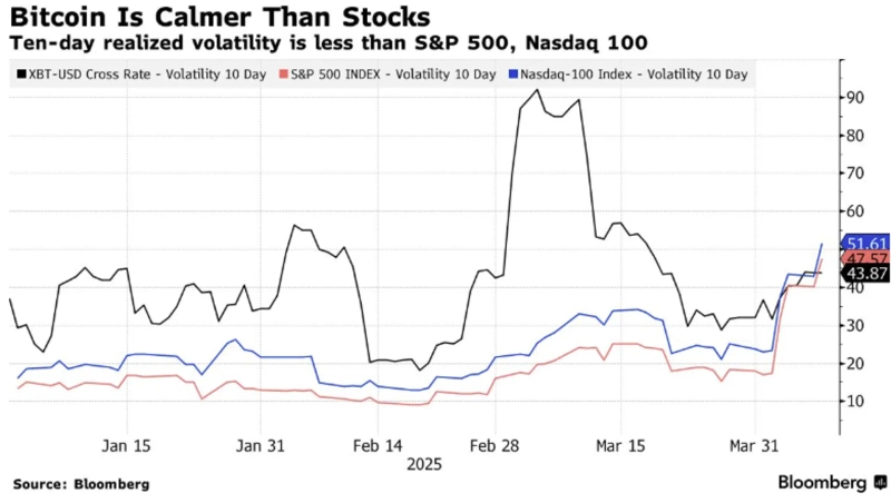 On the 8th (local time), Bloomberg News reported, "Since the announcement of Donald Trump's tariff policy, the stock market has shown more extreme volatility compared to Bitcoin, which is a historically significant change," and "Unlike stocks, digital assets seem to be less affected by tariffs."