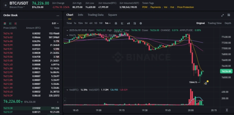 Bitcoin (BTC) also plummeted momentarily. As of 8:08 PM, Bitcoin is trading at $76,226 on the Binance USDT market, down 3.54% compared to 24 hours ago.