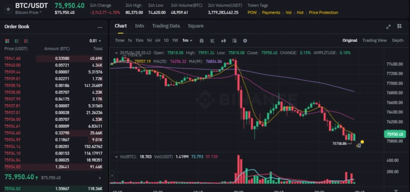 As of 8:44 PM (local time) on the 9th, Bitcoin is trading at $75,950, down 4.70% from 24 hours ago.