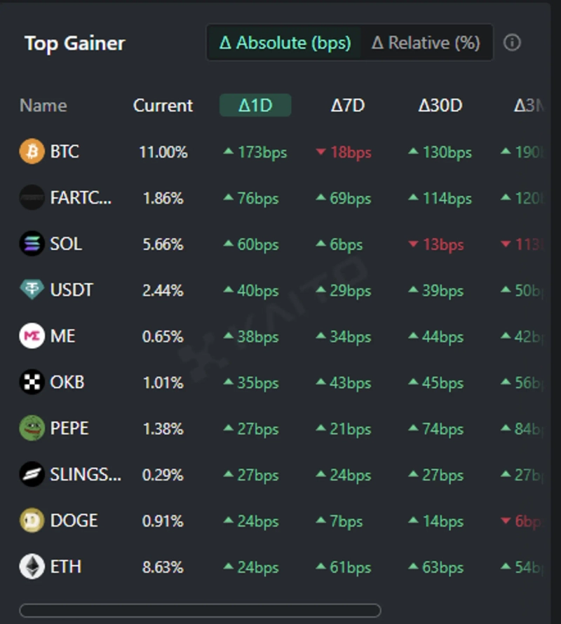 According to the Token Mindshare (a metric quantifying the influence of specific tokens in the virtual asset market) top gainers of the AI-based Web3 search platform Kaito, the top 5 virtual assets that people are most interested in as of the 10th are Bitcoin (BTC), Fartcoin (FARTCOIN), Solana (SOL), Tether (USDT), and Magic Eden (ME).